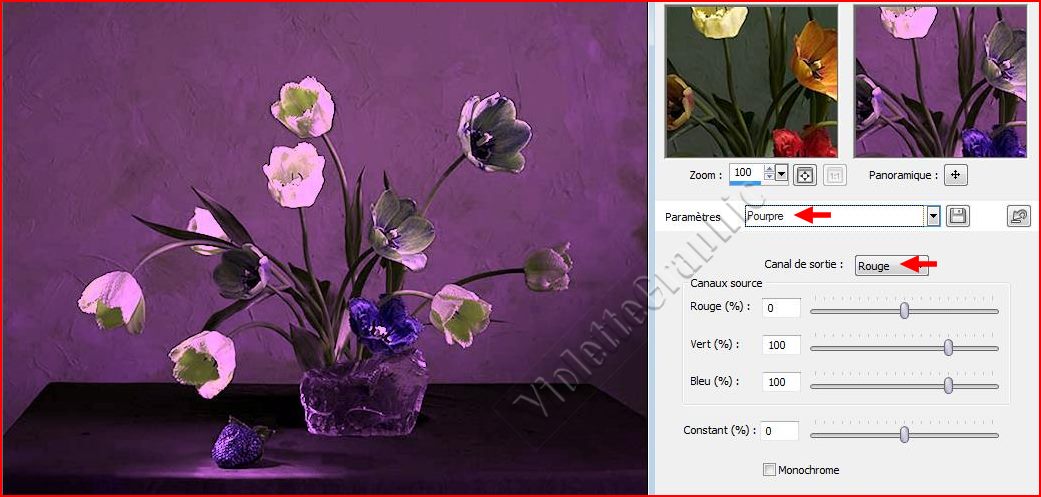 3 - Réglage/Couleur/Mélange des canaux réglages suivants : Pourpre