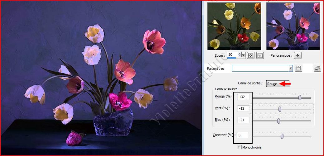 6 - Pour faire votre modification modifier modifier dans la liste déroulante Canal de sortie choix ici : rouge **Dans le pavé canaux source, entrez ou définissez des valeurs dans les zones Rouge, Vert et Bleu ou déplacez les curseurs correspondants, afin de modifier le pourcentage actuel de cette couleur dans le canal modifié