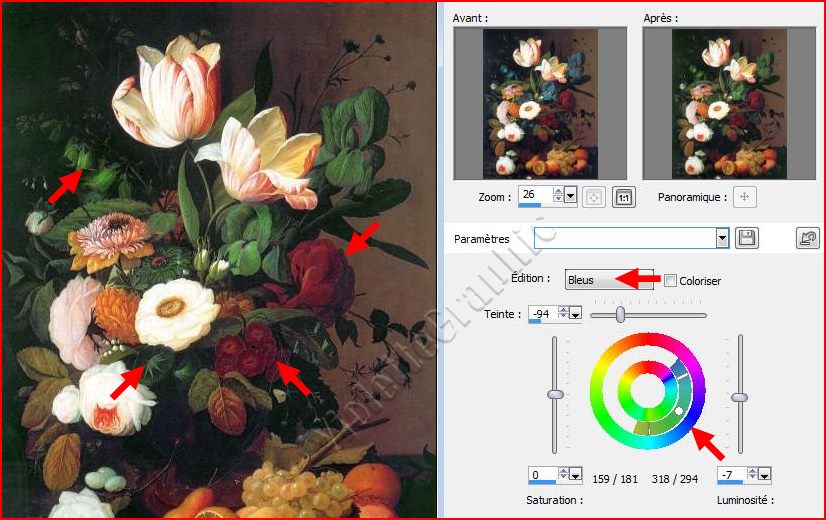 il faut alors agir sur les chiffres des teinte, saturation et luminosité pour retrouver la couleur choisie elle s'appliquera sur toutes l'image
