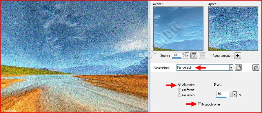 *** 2 - Activer votre image **Réglages/bruit/Ajouter du Bruit réglages par défaut : **Ouvrir la liste déroulante des différents paramètres :