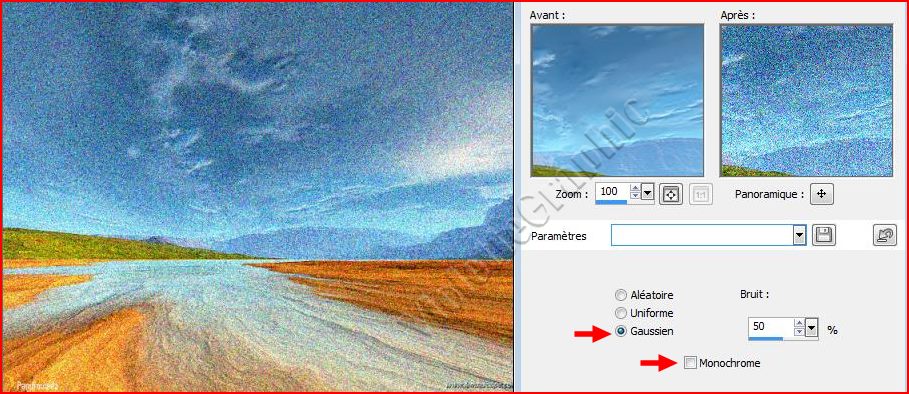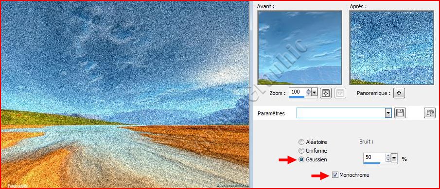 5 - Réglages/bruit/Ajouter du Bruit réglages suivants Gaussien /Monochrome coché