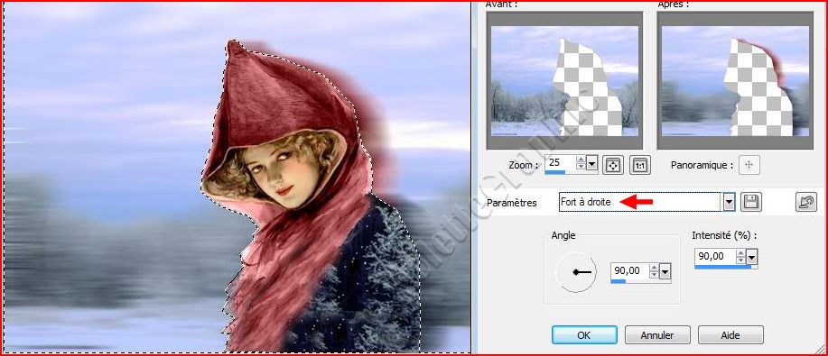 3 - Pour appliquer sur le fond sélectionner le personnage et sélection/inverser Réglages/Flou/Flou de mouvement réglages suivants: Fort à droite
