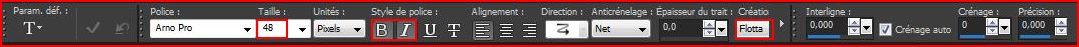4 - Activer l'outil texte configuré ainsi Police : Arno Pro ou au choix / taille: 48/ Style: Bold/Italique/ alignement gauche/ Création : flottante