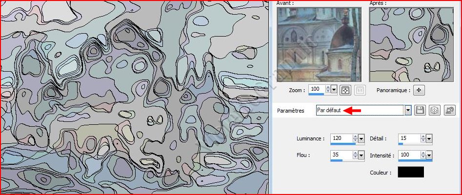 *** 3 - Avec ces réglages Luminance: 180Flou : minimum = 3Détail : moyen = 25 Intensité : 100 Couleur noire
