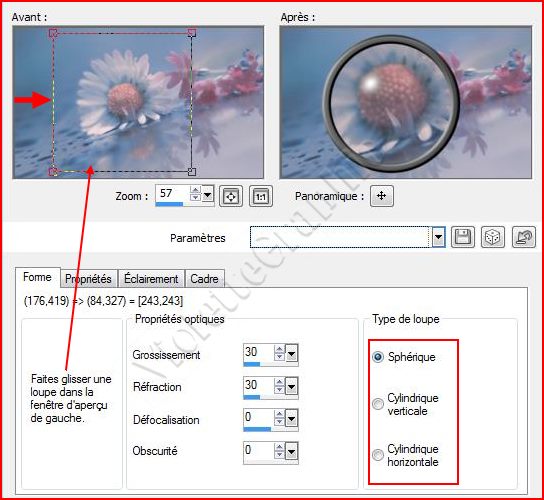 3 - La boîte de dialogue Loupe dispose de quatre onglets : Forme, Propriétés, Éclairement et Cadre