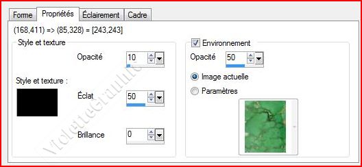 Style et texture : permet de choisir les couleurs, les dégradés et les motifs de la surface de l’image grossie Opacité : permet de définir l’opacité maximale de la surface Éclat : permet de définir le pouvoir réfléchissant de la surface Brillance : permet de définir le pouvoir réfléchissant de la surface Environnement : permet d’ajouter des détails à la surface de l’image grossie grâce à l’activation des commandes d’environnement Opacité : permet de définir l’opacité de l’environnement qui recouvre l’image grossie Image actuelle : permet d’utiliser l’image actuelle comme environnement Option et échantillon Environnement : permettent de choisir une image dans les dossiers des paramètres d’environnement