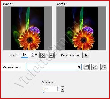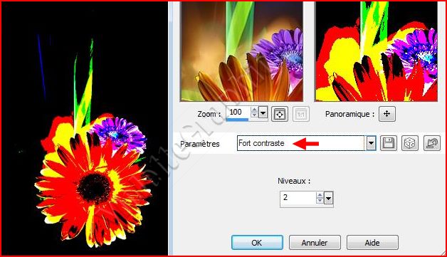 Niveaux : permet de diviser la plage des niveaux de luminosité (de 2 à 255) en un nombre d’incréments égaux Réduisez le nombre de niveaux pour obtenir une image dont l’aspect est plus plat
