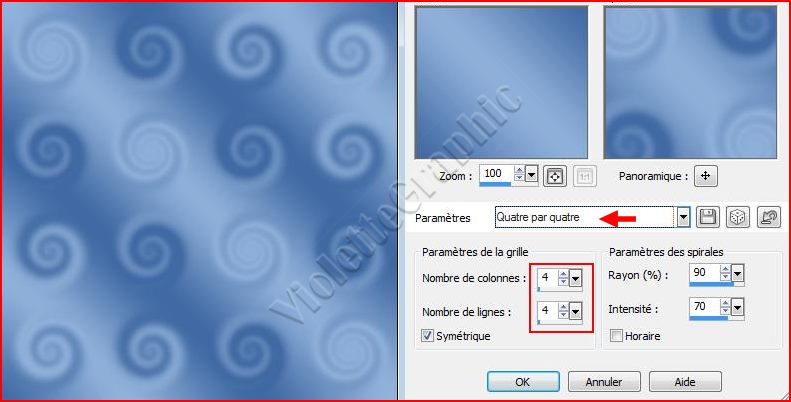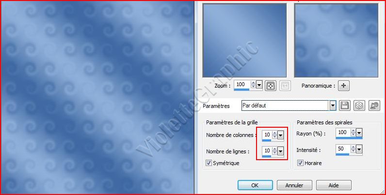 **Vous avez 10 colonnes et 10 lignes assez petites la case "Symétriques" cochée permet d'obtenir des valeurs de colonnes et de lignes identiques ici: 10 les spirales sont enroulées au maximum à 100% Intensité : le degré de rotation est moyen Sens horaire : le sens des enroulements est celui d'une montre