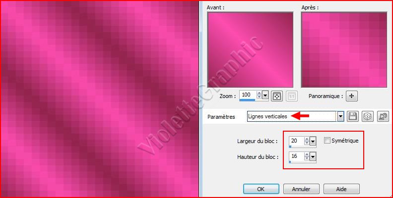 6 - Effets/Effets de distorsion/pixellisation réglages suivants : Paramètres de la grille : Lignes verticales