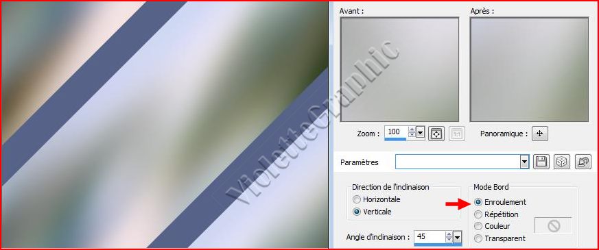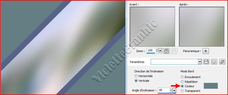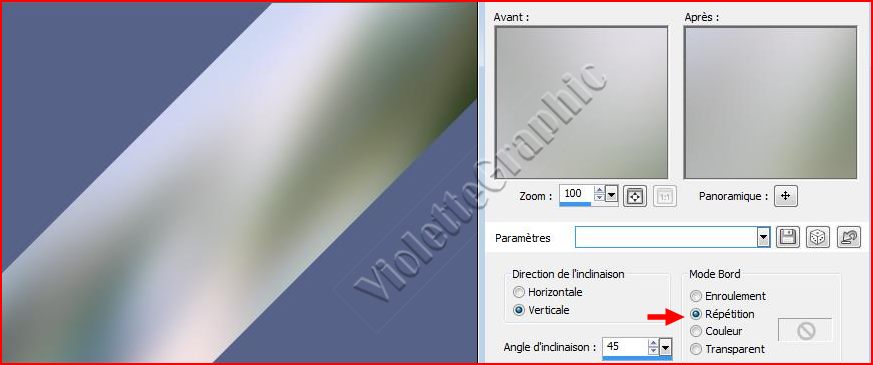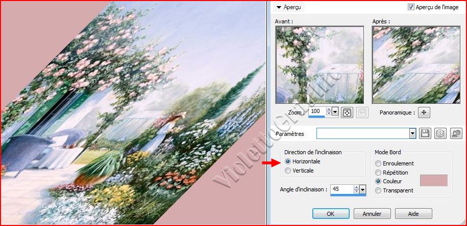 Horizontal : permet d’incliner l’image vers la gauche ou la droite selon la valeur du paramètre Angle d’inclinaison
