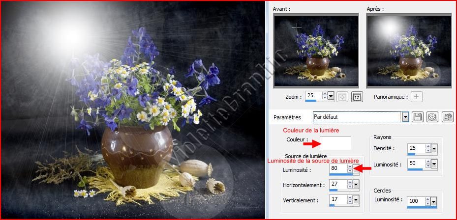 Densité : permet de déterminer la quantité de rayons lumineux émis par la source de lumière Luminosité du pavé Rayons : permet de contrôler la luminosité des rayons lumineux