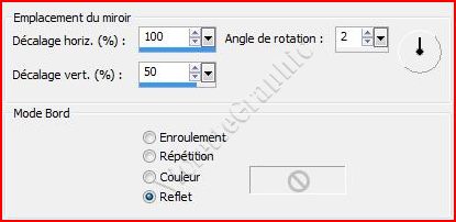 Décalage horizontal : permet d’éloigner le centre de la ligne de reflet du centre de l’image Décalage vertical : permet d’éloigner le centre de la ligne de reflet du centre de l’image Angle de rotation : permet de définir l’angle de rotation de la ligne Enroulement : une mosaïque est répétée à l’infini dans chacune des directions de l’image Répétition : détermine le pixel de bord de chaque contour et le répète à l’infini vers l’extérieur Couleur : permet de choisir la couleur des pixels hors limites Reflet : reflète le pixel du bord sur chaque côté