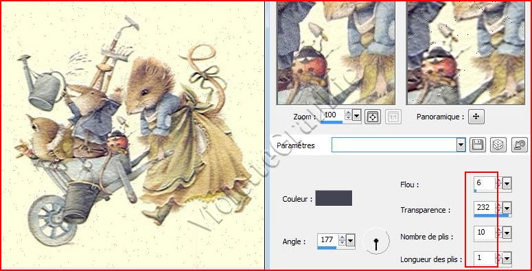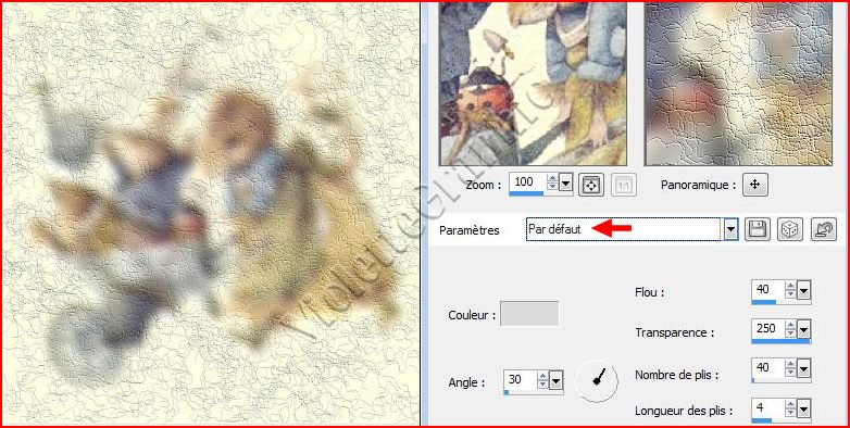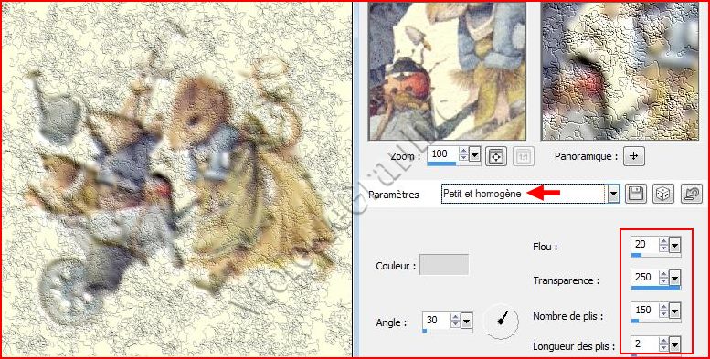 4 - Effets/Effets de Textures/Cuir Fin /Réglages suivants : Mes choix Nombre de plis : 10 Longueur des plis : 1
