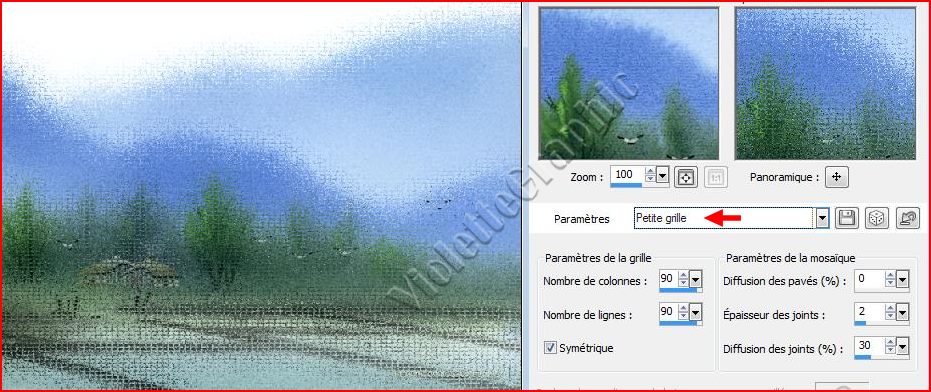 4 - Effets/Effets de Textures/Mosaïques Antique/Réglages suivantsPetite grille Paramètres de la grille: élevée Epaisseur des joints: 2 Diffusion des joints: 0