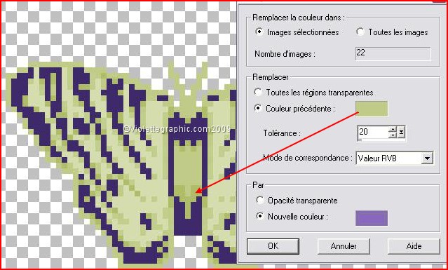 celle du haut: qui correspond à la couleur à remplacer : couleur précédente ici vert foncée : clic gauche sur votre papillon