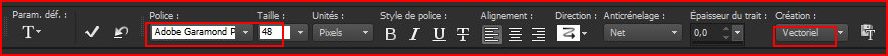**Activer l'outil  Texte/Police Adobe Garamond/taille : 48/ vectoriel/Crénage = 50