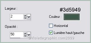 39 - Effets/Effets 3D/Ombre Portée : 5/5/70/10/couleur #243e2f Répéter avec des valeurs négatives : -5 en décalage vertical et horizontal Sélection/Désélectionner 40 - Image/Ajouter des bordures : 2 pixels couleur #243e2f