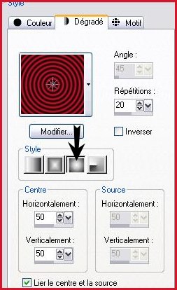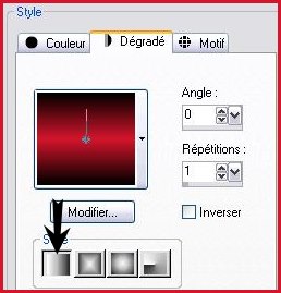 2 - Placer en avant-plan la couleur #000000 et en arrière-plan la couleur #d4162cConfigurer un dégradé linéaire/angle : 0°/ Répétition: 1