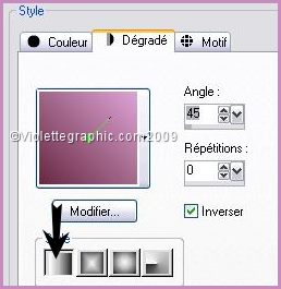 2 - Placer en avant-plan la couleur # dca2d4 et en arrière-plan la couleur #682941 Configurer un dégradé linéaire angle: 45°/Répétition: 0/Inverser coché