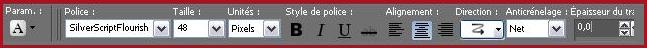 40 - Calques/NOUVEAU CALQUE 41 - Activer l'outil Texte/Police Silverscriptflourishes/taille : 48 /avant-plan fermé /couleur arrière-plan #920d19