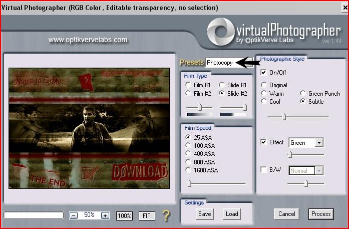 19 - Calques/NOUVEAU CALQUE en avant-plan la couleur #800000 20 - Activer l'outil pinceau et disposer les pinceaux de votre choix 21 - Effets/Effets 3D/Ombre Portée : 1/1/50/1/blanc 22 - Calques/Fusionner les calques visibles 23 - Effets/Filtre OpticVervelabs/Virtual Painter avec ces réglages: Photocopy