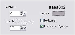 19 - Image/Ajouter des bordures : 1 pixel couleur #ffffff 20 - Image/Ajouter des bordures : 69 pixels couleur #e5e3e7 21 - Placer votre signature 22 - Exporter en JPEG Optimisé