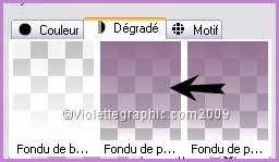 13 - Placer en avant-plan la couleur # 927091 et en arrière-plan la couleur #ffffffConfigurer un dégradé linéaire angle: 0°/Répétition: 0/Inverser coché Sélectionner le fondu du dégradé