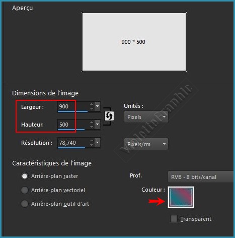 - Fichier/Nouvelle image de 900 x 500 pixels et choisissez immédiatement le dégradé