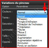 Normal : aucune variation n’est appliquée Pression : la variation est appliquée à l’attribut du pinceau sélectionné en fonction de la pression appliquée à partir du stylet d’une tablette Angle d’inclinaison : la variation est appliquée en fonction de l’angle formé par le stylet et la tablette. Direction de l’inclinaison : la variation est appliquée en fonction de l’angle de rotation de la pointe du pinceau Orientation : la variation est appliquée en fonction de l’angle de rotation autour du styletStylet : permet de contrôler la variation de l’attribut du pinceau à l’aide de la roulette du stylet d’un aérographe Roulette : permet de contrôler l’attribut du pinceau à l’aide de la roulette d’une souris 4D dont le comportement est configuré selon l’application active Direction : contrôle la variation du pinceau en fonction de l’angle formé par deux points consécutifs de la souris sur un tracé Augmentation : augmente l’empreinte du pinceau Augmentation répétitive : augmente l’empreinte du pinceau de façon répétitive. Diminution : diminue l’empreinte du pinceau Fondu avec oscillation : augmente et diminue l’empreinte du pinceau de façon répétitive