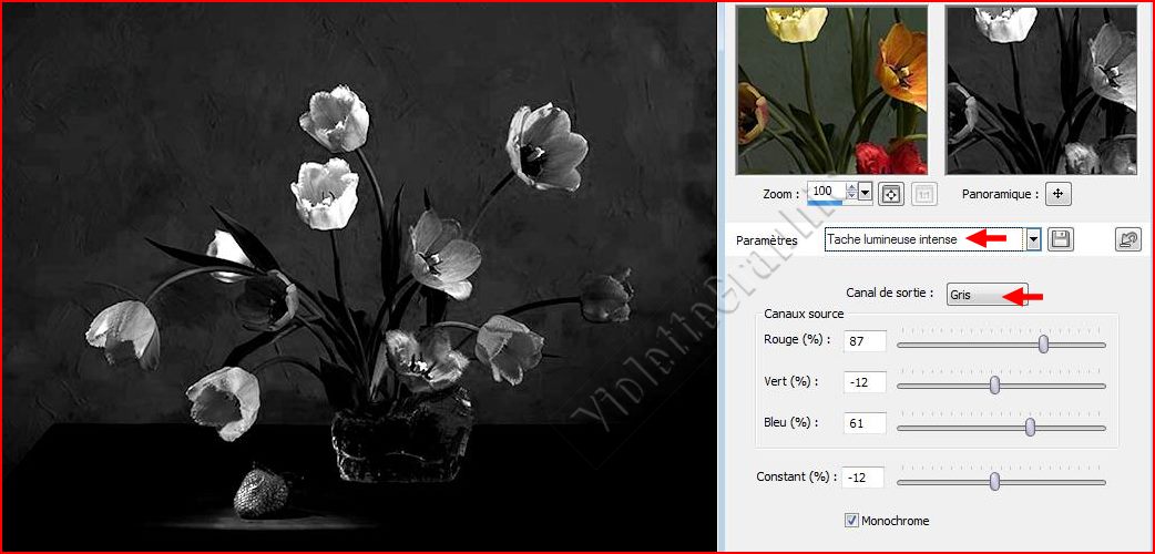 6 - Pour faire votre modification modifier modifier dans la liste déroulante Canal de sortie choix ici : rouge **Dans le pavé canaux source, entrez ou définissez des valeurs dans les zones Rouge, Vert et Bleu ou déplacez les curseurs correspondants, afin de modifier le pourcentage actuel de cette couleur dans le canal modifié