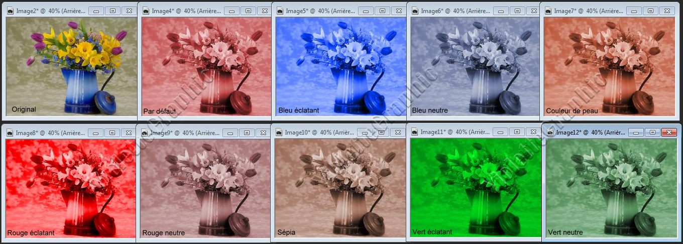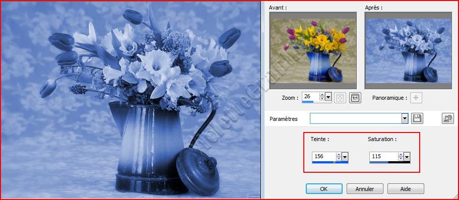 Teinte: spécifie la teinte appliquée à toutes les couleurs Saturation: spécifie la saturation de la teinte sélectionnée
