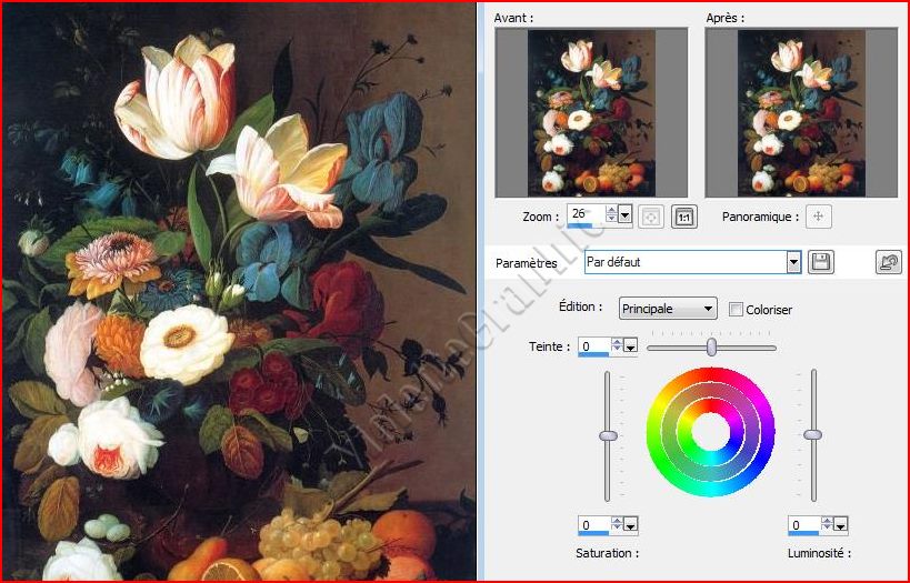 *** 2 - Activer votre image ** Réglages/Teinte et saturation/Teinte/saturation/Luminosité réglages par défaut :Ouvrir la liste déroulante des différents paramètres :