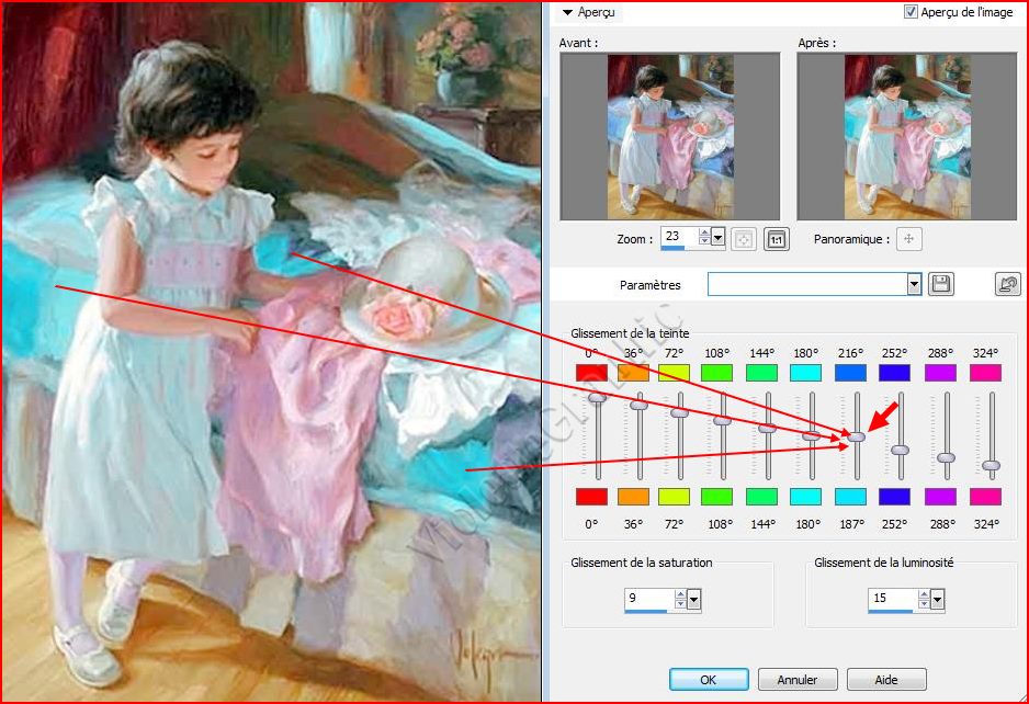 *** 2 - Activer votre image **Réglages/Teinte et Saturation/Glissement de la teinte réglages par défaut Ouvrir la liste déroulante des différents paramètres :