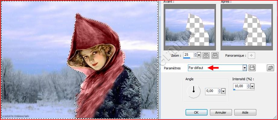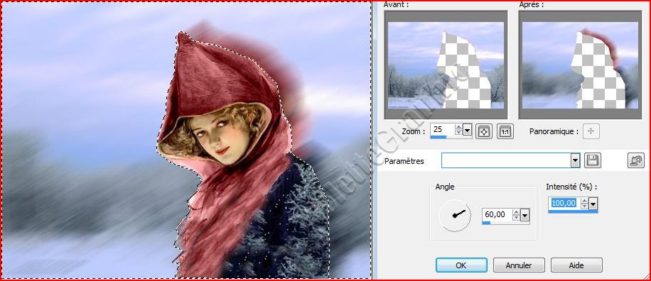 Dans le pavé Angle : entrez une valeur dans la zone, pour définir l’angle selon lequel l’effet de flou est appliqué Entrez ou définissez une valeur dans la zone Intensité Cliquez sur OK