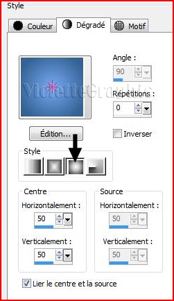 ** remplir de dégradé linéaire radial: 90°/Répétitions: 100/Inverser non coché **Sélection/ne rien sélectionner