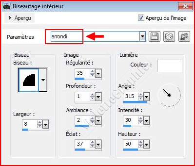 **Effets/Effets 3D/Biseautage Intérieur réglages suivants : choisir les paramètres: arrondi