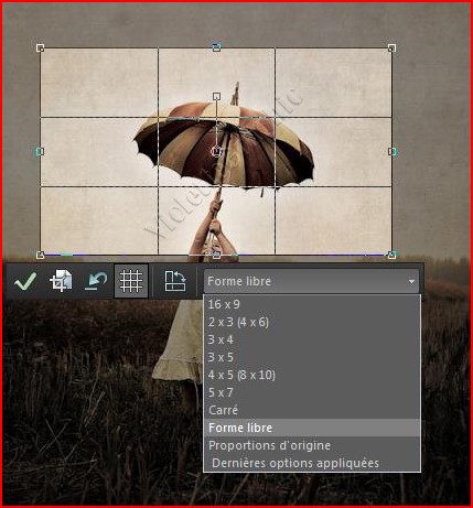 5 - Pour réduire ( ou agrandir ) le cadre de recadrage saisir les poignées centrales ou verticales et déplacer les bords ou choisir une taille prédéfinie