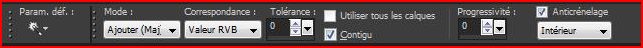 8 - Ajouter des bordures : 40 pixels couleur blanche Placer ces options : Correspondance: aucun Mode Mélange: normal Opacité: 100 Sélectionner la bordure avec la baguette magique ( Tolérance et Progressivité à 0 ) Avec la pipette ,clic gauche dans l'avant-plan