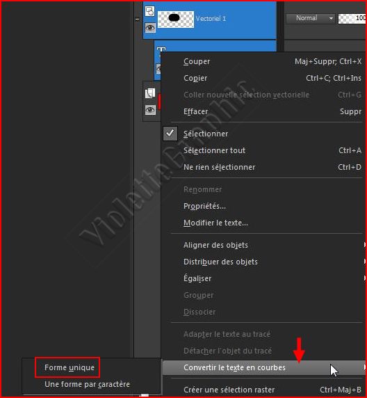 7 - clic droit sur le calque de la lettre T Convertir le texte en courbes/ Forme unique