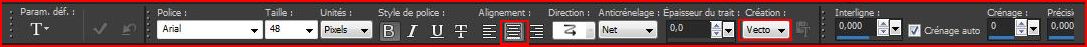 5 - Activer l'outil texte configuré ainsi : Police : Arial ou au choix / taille: 48/ Style: Bold/ alignement centré/ Création : vectoriel