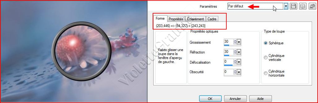 3 - La boîte de dialogue Loupe dispose de quatre onglets : Forme, Propriétés, Éclairement et Cadre