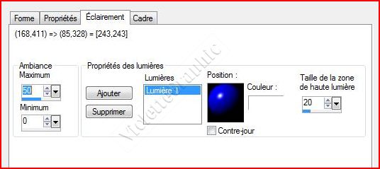 Maximum : permet de définir la valeur maximale de l’éclairement général de l’objet Minimum : permet de définir la valeur minimale de l’éclairement général de l’objet Ajouter et Supprimer et menu Projecteurs : permettent d’ajouter ou de supprimer les projecteurs indépendamment les uns des autres Position : permet de déplacer le faisceau lumineux Contre-jour : permet de donner l’illusion que le projecteur se trouve derrière l’objet Couleur : permet de choisir la couleur de chaque projecteur