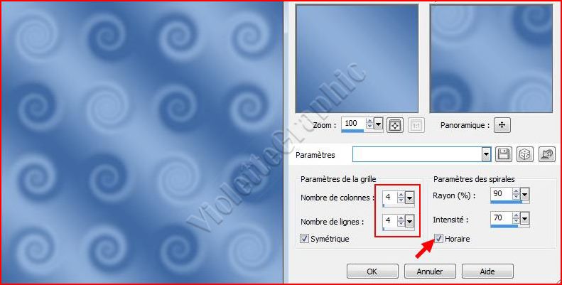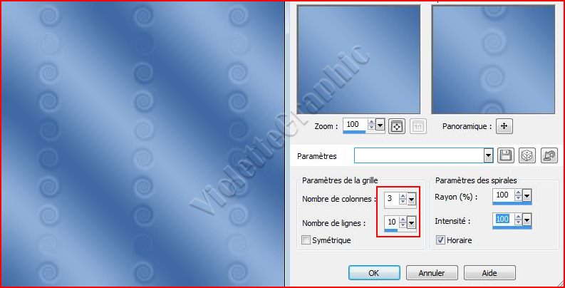 **Vous avez 10 colonnes et 10 lignes assez petites la case "Symétriques" cochée permet d'obtenir des valeurs de colonnes et de lignes identiques ici: 10 les spirales sont enroulées au maximum à 100% Intensité : le degré de rotation est moyen Sens horaire : le sens des enroulements est celui d'une montre