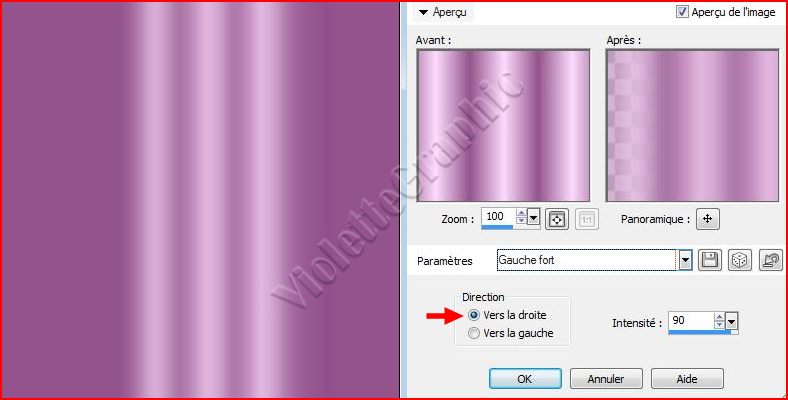 Pavé Direction : permet de sélectionner la direction Vers la droite ou Vers la gauche Intensité : permet de définir l’intensité de la déformation Augmentez l’intensité pour rendre l’image plus floue