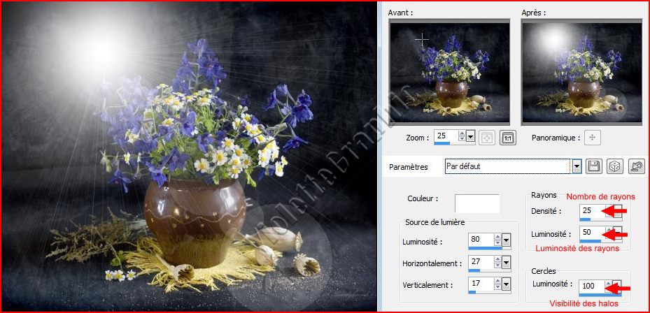Densité : permet de déterminer la quantité de rayons lumineux émis par la source de lumière Luminosité du pavé Rayons : permet de contrôler la luminosité des rayons lumineux