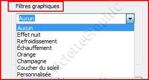 Effet nuit : Applique un filtre bleu nuit pour donner l’illusion que la photo a été prise au crépuscule ou au clair de lune Refroidissement: Atténue la couleur des images Échauffement : Rehausse légèrement les couleurs Orange : Rehausse les couleurs pour intensifier les photos aux tons chauds Champagne : Rehausse subtilement les couleurs. Cet effet convient particulièrement aux portraits, notamment lorsqu’il est associé à l’aspect chromatique Glamour Coucher du soleil : Simule la lumière rouge orangée du crépuscule Personnalisée : Permet de choisir une couleur de filtre