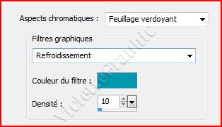 7 - Activer les choix suivants : Choisir l'aspect chromatique : Feuillage Verdoyant un filtre : refroidissement Préréglages: Choisir une couleur de filtre personnalisée : bleu/vertEntrez une valeur dans la case Densité : 10