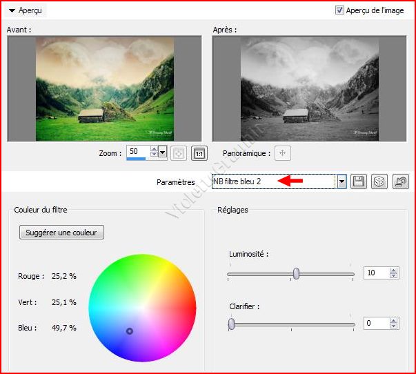 4 - Choisir NB Filtre bleu 2 Les valeurs Rouge, Vert et Bleu et le volet Après sont mis à jour