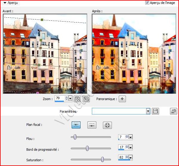 Flou : détermine l’intensité du flou en dehors du plan focal Bord de progressivité : détermine la douceur de la transition entre la zone nette et la zone floue Vous pouvez également régler la progressivité de façon interactive en faisant glisser une poignée de progressivité (sur les lignes formées de points) dans le volet Avant Saturation : détermine l’intensité des couleurs de la photo. L’augmentation de la saturation permet de reproduire les couleurs éclatantes utilisées pour les modèles et les jouets.