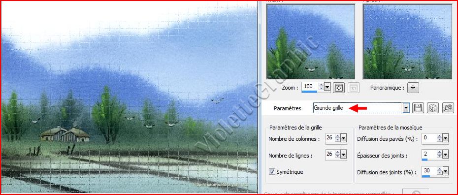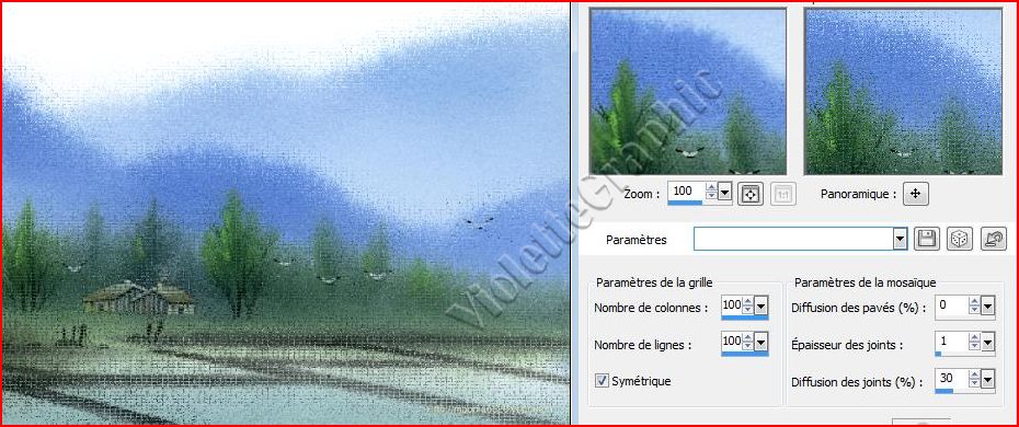 4 - Effets/Effets de Textures/Mosaïques Antique/Réglages suivantsPetite grille Paramètres de la grille: élevée Epaisseur des joints: 2 Diffusion des joints: 0